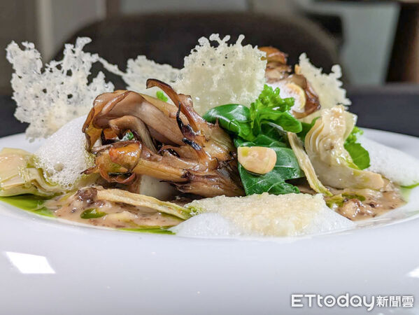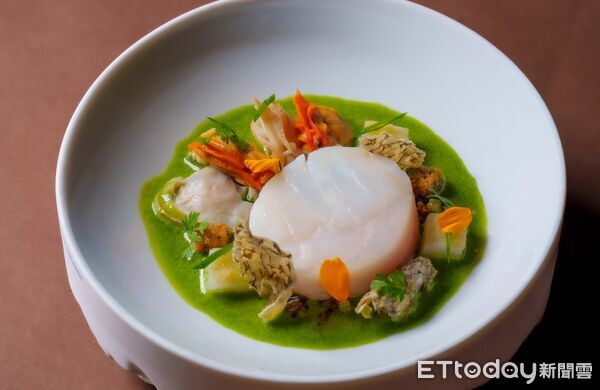 「挪威洄游鱈魚.蛤蜊.韭菜」使用挪威北極洄游鱈魚搭配炙烤花枝、蛤蜊,濃綠醬汁為韭菜混合蛤蜊蔬菜高湯。「朝鮮薊.鮑魚.斯佩耳特小麥」則是把紫朝鮮薊精修後保留花形,先油封再炸至邊緣焦脆、底部酥軟,搭配彈嫩鮑魚與斯佩耳特小麥;醬汁以焦糖、鯷魚、黑橄欖與檸檬製成,深具南法風情。晚間套餐9道式品味菜單6288+10%、6道式季節菜單3888元+10%。