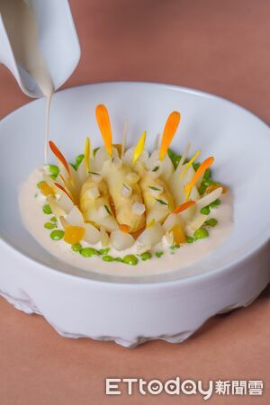 ▲本季新菜「白蘆筍.白蝦.甜豆仁」。(圖/業者提供)