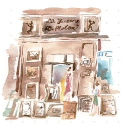 可可色的木頭門上有著歷盡歲月的痕跡,散落地上、牆上的掛畫像美酒一樣,多看幾幅就醉了。他其實不賣酒。他賣「美酒的年齡」、「城堡的標籤」、「典藏的銅綠」、「性感的詩句」。
