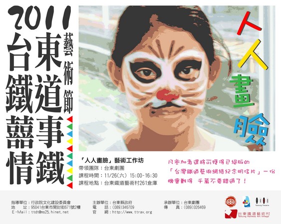 2011台東鐵道藝術節面面聚道-臉譜藝術為主題的靜態展覽「生相」,將於本周六(11月26日)下午3點進行延伸活動-「人人畫臉」藝術工作坊。工作坊課程免費,將由在地藝文團隊台東劇團,帶領民眾體驗彩繪臉譜,及角色變裝的樂趣。